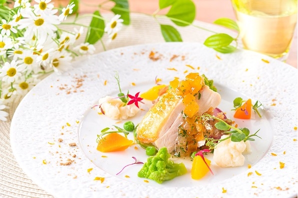 「チキンと彩り野菜のオレンジソース」は、その名の通り、彩り良く盛り付けた鶏肉と野菜に、旨味たっぷりのチキン出汁に柑橘の爽やかなアクセントが効いたソースを添えてご提供いたします。