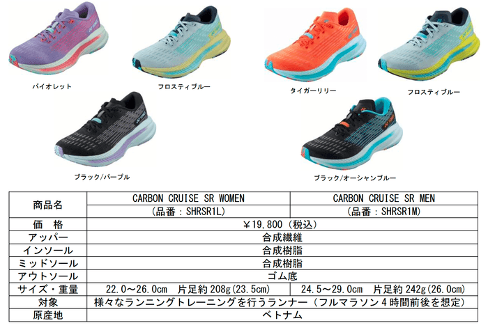 「CARBON CRUISE SR」は、高反発と軽さを両立するミッドソール設計に加え、爪先まで伸長し、スピードに対応するため剛性を高めた新形状「3Dパワーカーボン」を底面に搭載。タイムを狙い、より速いスピード走行を求めるランナーに向けた一足です。
