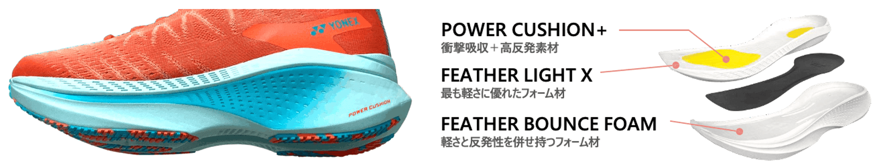 ヨネックス史上最も厚い40mm超えのミッドソール設計※。反発性と軽さを併せ持つ「FEATHER BOUNCE FOAM」を従来品から約30%以上増量し、跳ね返りに特化した高い反発感を実現しました。