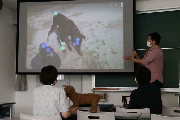 李教授はまず、動画内に写る物体の特徴点を自動で追跡するツールの活用を提案しました。例えば、犬の手足や肩、鼻先、尻尾など骨の特徴点(骨格点)から歩く速度、足の高さ、角度、歩幅などの特徴量を算出し、積み重ねた時系列データをもとに歩き方を捕えます。「これで、異常検知や行動分類、予測などの多変量解析を行えるではないか、ペットの様子を数値化できるのではないかとみています」と李教授。