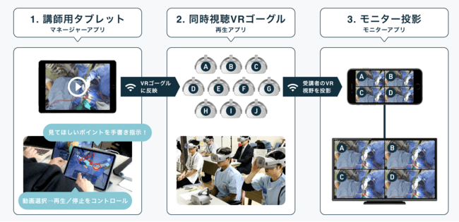 VRマルチセミナーシステムは、講師用タブレットと複数のVRゴーグルを一斉操作し、VRセミナーの簡単運用を実現します。