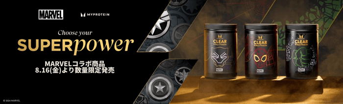 マイプロテインの人気商品「クリアホエイプロテイン」からは、超人的な力と壁に張り付く能力を誇るスパイダーマンにインスパイアされた<ラズベリー&ストロベリーフレーバー>、驚異的な筋力と耐久力を持つハルクにインスパイアされた<ウメ&キウイフレーバー>、そして俊敏性を兼ね備え世界平和のために戦うブラックパンサーにインスパイアされた<ブルーラズベリーフレーバー>が誕生しました。この他にもスクープや、3人のスーパーヒーローの絵柄を施した、耐久性に優れたメタルシェイカーも登場。今回発売する「Marvel コラボ詰め合わせBOX」はこれらを一度にお試しいただける豪華な内容となっています。