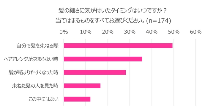 暑い夏、髪を束ねる機会も多い。「以前より髪が細くなった」と答えた174名に「髪の細さに気が付いたタイミングはいつですか?」と聞くと、「自分の髪を束ねる時」が49%と最も多く、「ヘアアレンジが決まらない時」が続いた。