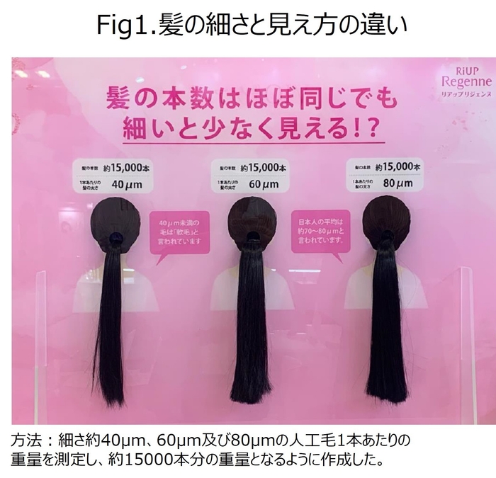 Fig1は、細さ約40µm、60µm及び80µmの人工毛約15000本分を束ねた時の見え方の違いを示したものです。髪の本数はほぼ同じでも髪が細いと毛束にした時のボリューム感が少なく見えます。以前よりも髪が細くなってきた場合、壮年性脱毛症かもしれません。髪を束ねる時等、ヘアセット時には普段からチェックをしましょう。
