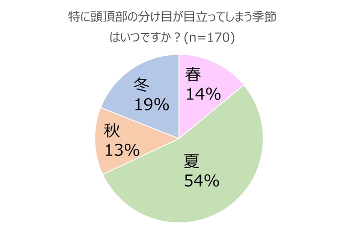 「分け目の透け感が気になる」と答えた170名に「特に頭頂部の分け目が目立ってしまう季節はいつですか?」と聞くと、「夏」が54%と最も多かった。その理由として、「帽子をかぶり汗もかくので髪の毛がペタンコになってしまう」、「太陽の光で地肌が照らされて透けて見えそうな気がする」があげられた。