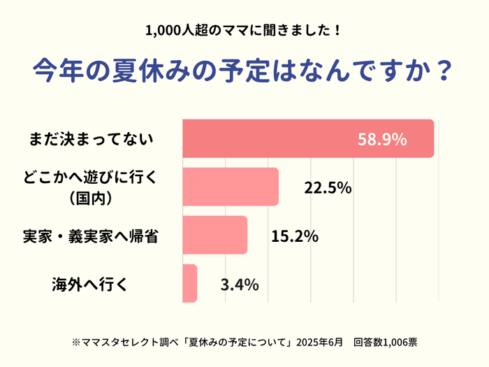 「今年の夏休みの予定はなんですか?」と問いかけ、選択肢には「どこかへ遊びに行く(国内)」「実家・義実家へ帰省」「海外へ行く」「まだ決まっていない」の4つを設定。1,000名を超えるママたちから回答を得ることができました。