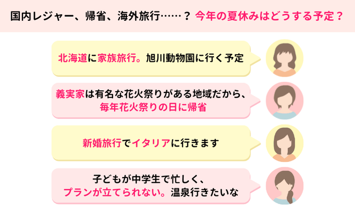 もっとも多かったのは「まだ決まってない」と回答した人で、全体の58.9%と過半数を占めました。「海やプール、公園に行きたい」「花火をしたい」「安・近・短でも何かしたい」といったコメントが多く寄せられ、具体的な予定が決まっていなくても“夏を楽しみたい”という意欲がうかがえます。一方で、「中学生の子どもが忙しく予定が立てられない」「夫婦ともに仕事でスケジュールが合わない」といった現実的な理由も見受けられ、家庭ごとの事情がにじみ出る結果となりました。