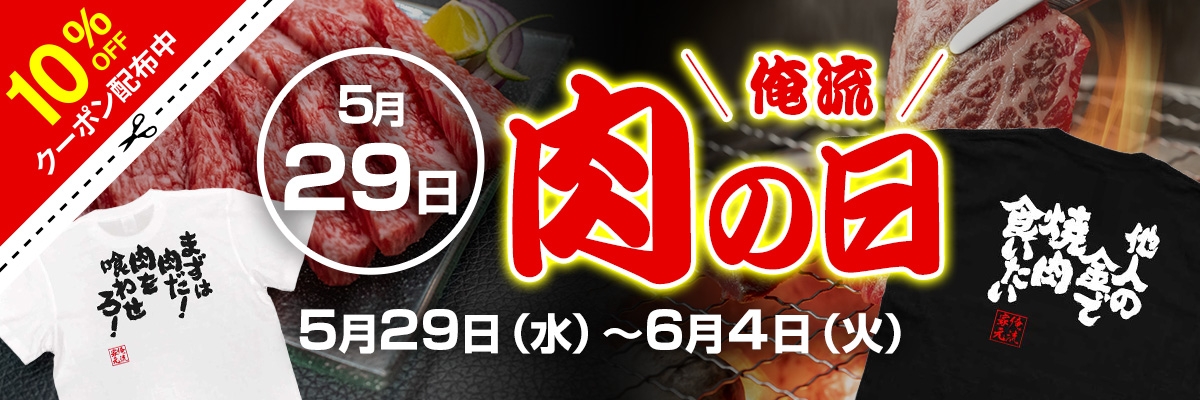 俺流総本家は、5月29日に【俺流肉の日!!】を開催いたします。肉の日に特別なキャンペーンとして、当社厳選の肉Tシャツを対象に10%オフのクーポンを配布いたします。