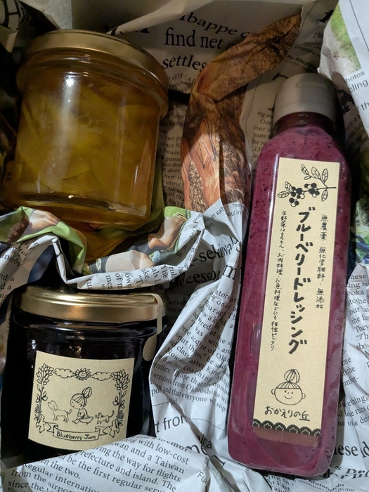 ③内容: 北部ハイブッシュブルーべリー、自然栽培ブルーベリー加工品、特別栽培米の米粉入りうどん、おせんべい、じゃがいもおかき、季節のお野菜など