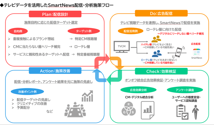 本サービスは、オフラインメディアとオンラインメディアを掛け合わせたオンオフ統合のデジタルマーケティングを検討している企業向けに、「TVBridge DMP」のテレビ視聴データとSmartNewsを連携することにより、デジタル広告配信の最適化や広告効果検証を支援し、広告効果の最大化を目指します。