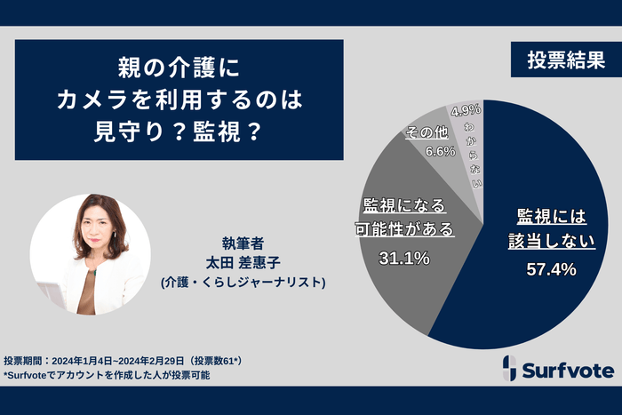 親の介護にカメラを利用するのは見守りか監視か? Surfvoteの投票では57.4%が「見守り」として肯定する一方、31.1%は親子の関係性によっては「監視になる」として心配する声が寄せられました。