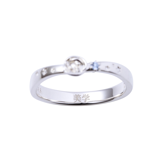 華やかなバラモチーフをデザインしたV字フォルムにイメージカラーストーンをセット。表面には美少年探偵団の6人を連想した6つの星を取り込みました。指輪の内側には「美学」を刻印。