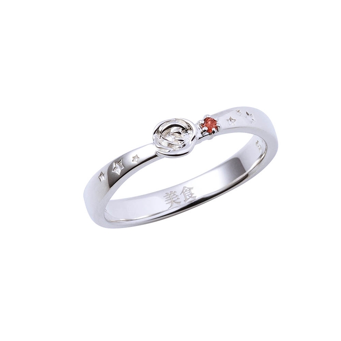 華やかなバラモチーフをデザインしたV字フォルムにイメージカラーストーンをセット。表面には美少年探偵団の6人を連想した6つの星を取り込みました。指輪の内側には「美食」を刻印。