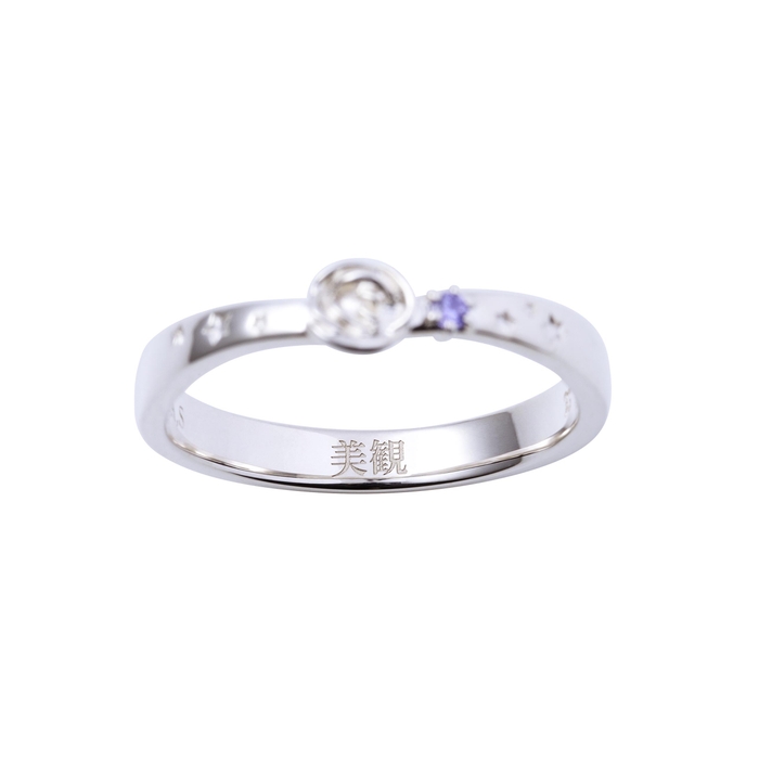 華やかなバラモチーフをデザインしたV字フォルムにイメージカラーストーンをセット。表面には美少年探偵団の6人を連想した6つの星を取り込みました。指輪の内側には「美観」を刻印。