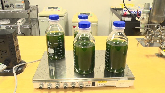 実験に使うのは海や川に生息する生物「藻」。タンパク質やビタミンを多く含むため、青汁、サプリメントといった健康食品からシャンプー、入浴剤まで幅広く使われています。