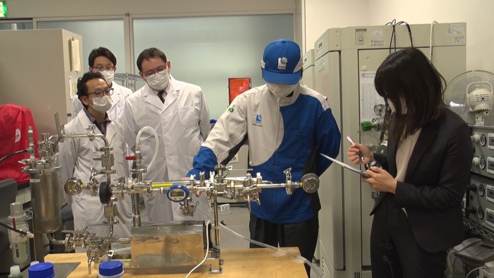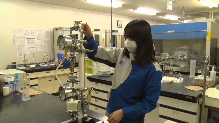 別の日、セラミックフィルターのプレゼンをするために千葉県柏市にある東大発のベンチャー企業「アルガルバイオ」を訪れた高江洲さん。実験の準備をしています。