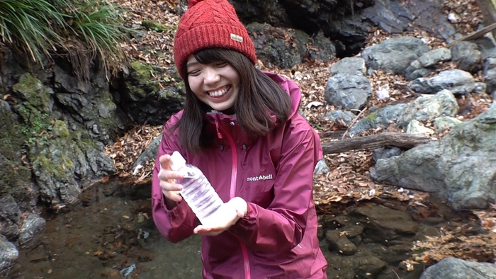 “湧き水”と“この湧き水を製品化したミネラルウォーター”を飲み比べて「変わらずおいしい」とにっこり。自社で開発したセラミックフィルターを使うことで、細菌や不純物といった身体に良くない成分だけを取り除き、湧き水のおいしさとミネラルなどの栄養分をそのまま残したミネラルウォーターが実現しました。
