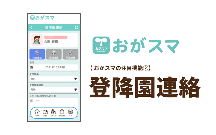 保護者は「おがスマ」から[欠席・遅刻・早退]の連絡を、施設の「おが~るシステム」へ送ることができます。