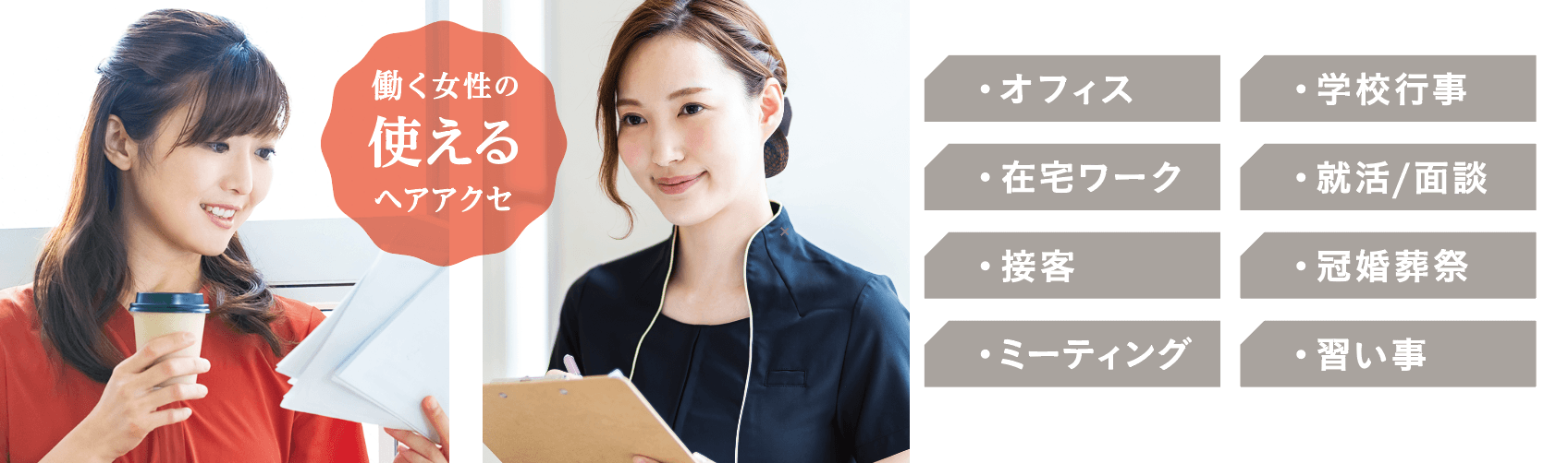 そこで、ビューティーワールドは派手な髪型ができない働く女性が手軽に、すっきり髪をまとめることができ、なおかつオシャレに見えるヘア小物を考えました。「JOBCOージョブコ」というブランドを立ち上げ、アイテムを提案いたします。