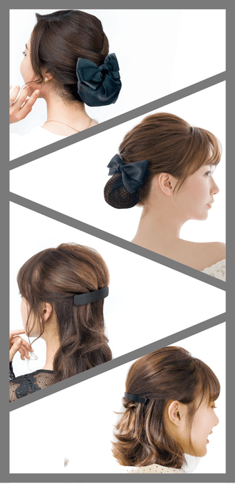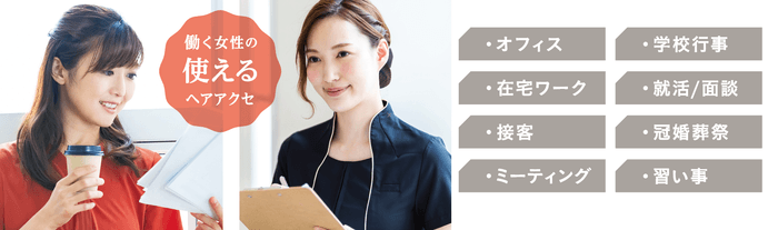 長時間つけていても圧迫による痛みがない「痛くないシンプルカチューシャ」、顔に髪がかからないようにしっかりとまる「しっかり引きあげコームカチューシャ」、お団子ネットが取り外せる「2Wayお団子リボンバレッタ」、毛先のヘアカラーの色を隠せる「毛先カバーお団子リボンバレッタ」、トップをふんわりさせたまま長時間キープできる「ふんわりピチットバレッタ」、しっかり止まって長時間乱れない「ピチットバレッタ」の6種類。どれも働く女性にはうれしい機能でシーンを選ばずにお使いいただけます。
