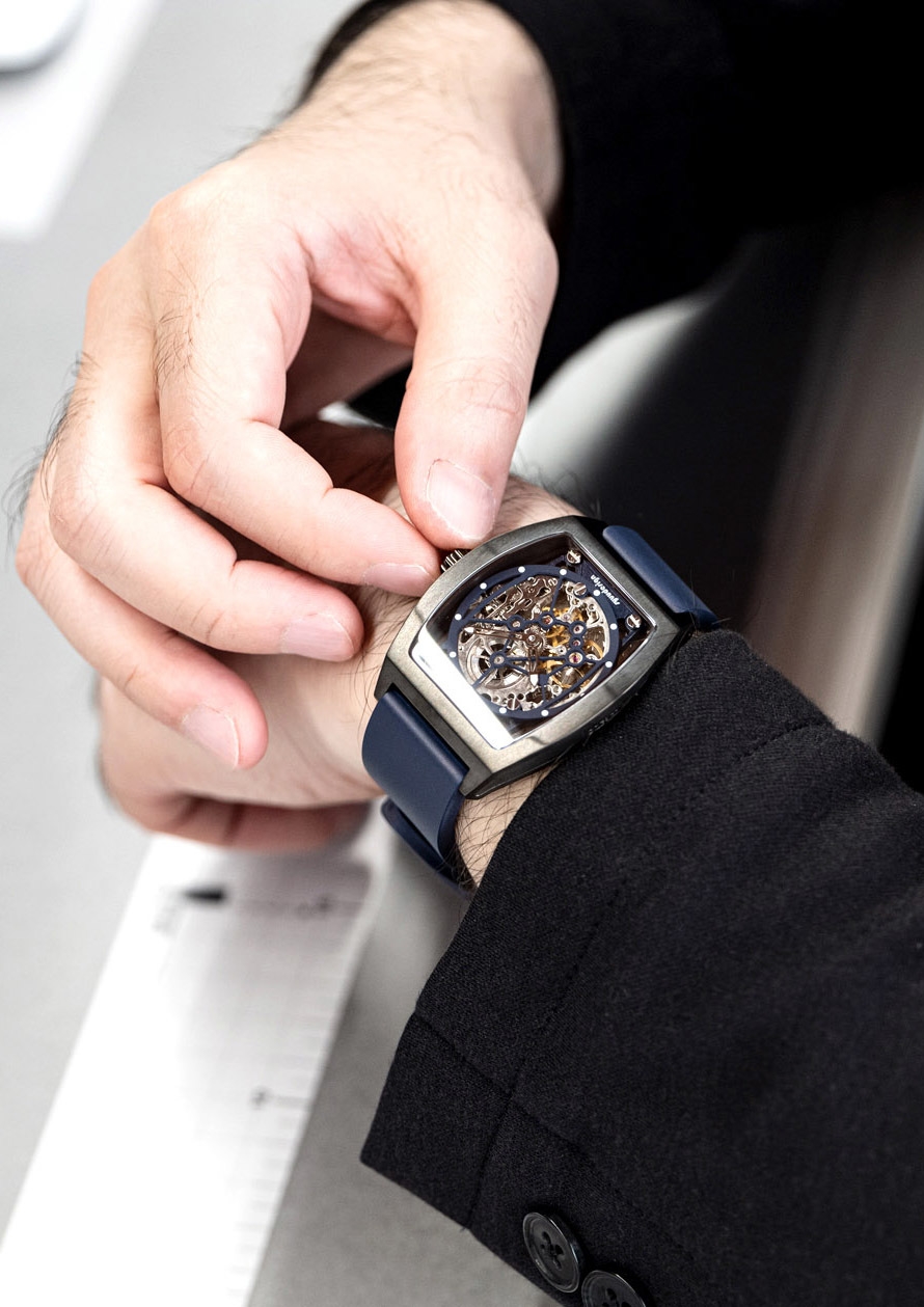 ショウケースのように美しいトノー型のボディに、厚さ3mmにも満たないスケルトン機械式ムーブメントが大切に格納されているようなエクステリアに仕上がりました。クラウドファンディングのMakuakeで、先行予約を4月6日まで受付中。4型から選択することができます。