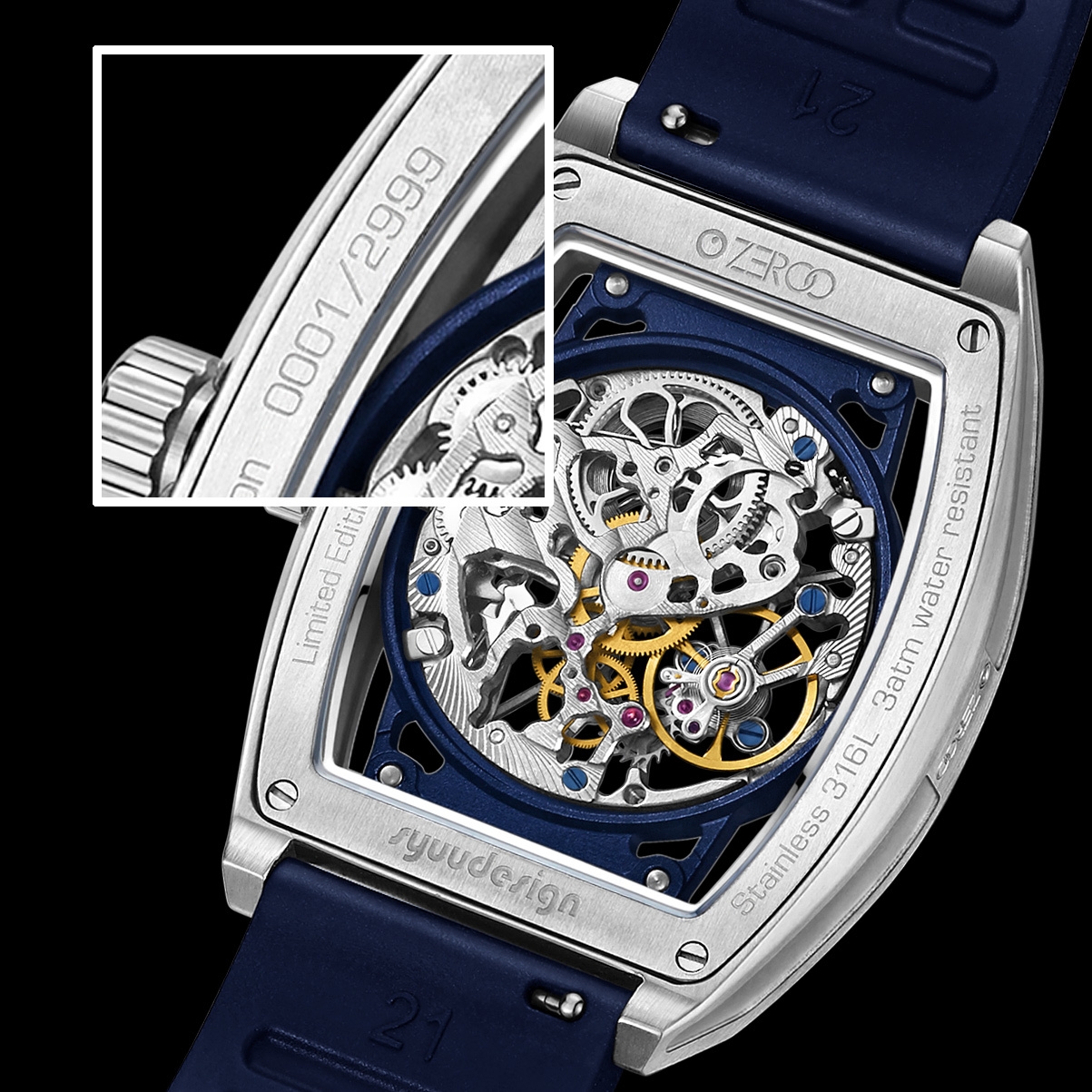 3mmにも満たない極薄機械式手巻きスケルトンムーブメントを美しいトノー型ケースに収めました。見た目の美しさ、格好良さだけでなく、素材にもこだわっています。本体ケース素材には高級ブランドが採用するものと同じ316Lステンレススチールを、風防も同様にサファイアクリスタルを仕様し、デザイン、素材、使い勝手にもこだわり抜いています。