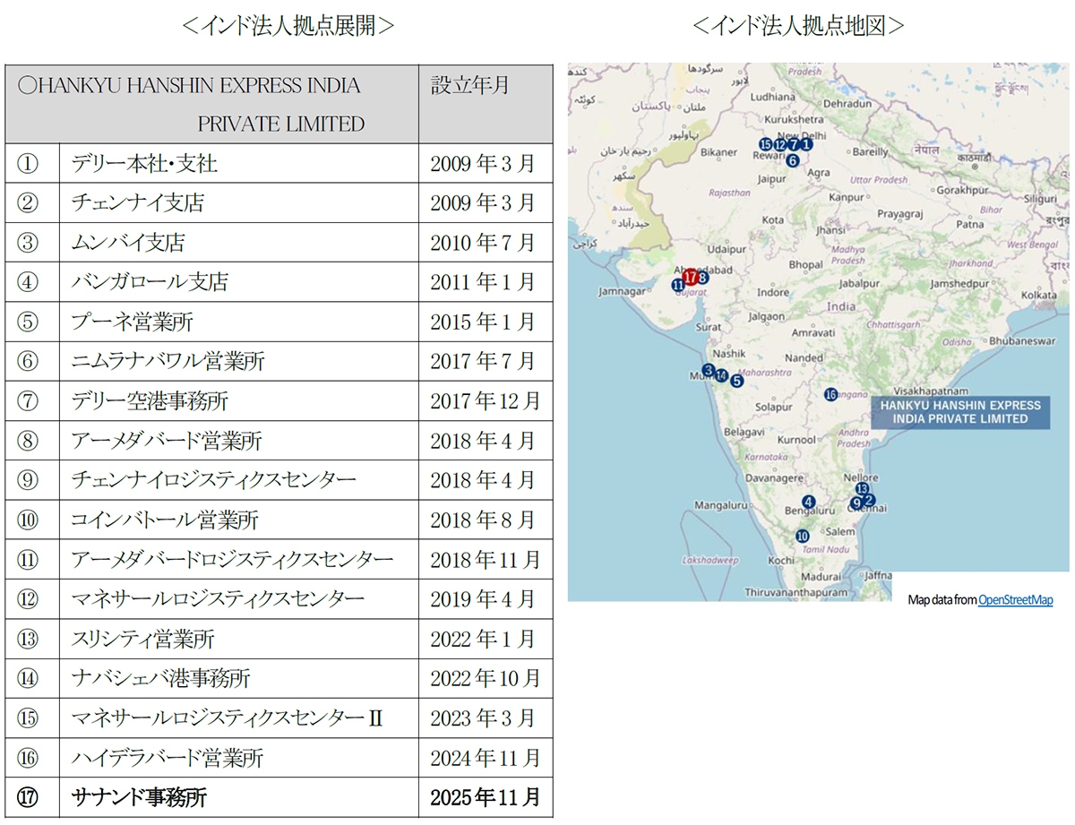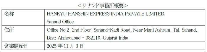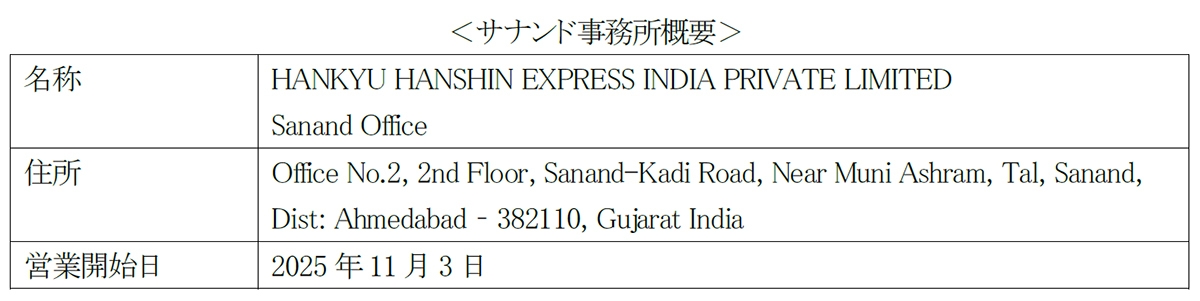 阪急阪神エクスプレス(本社:大阪市北区 代表取締役社長:谷村 和宏)のインド法人である HANKYU HANSHIN EXPRESS INDIA PRIVATE LIMITED(本社:デリー)は、インド西部のアーメダバード市近郊のサナンドに新たに事務所を開設し、11月3日より業務を開始します。
