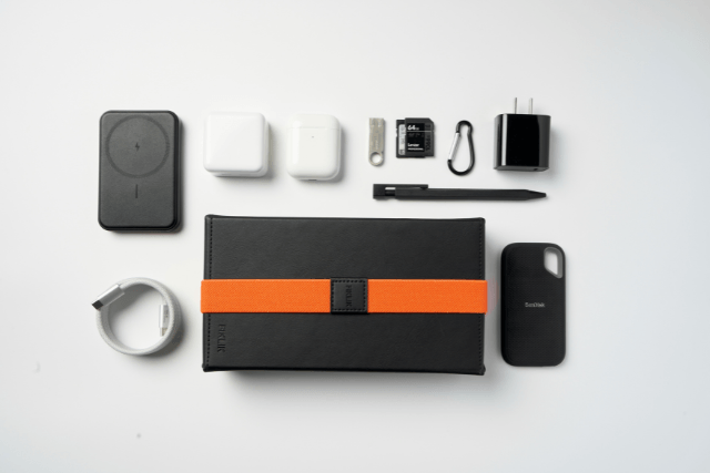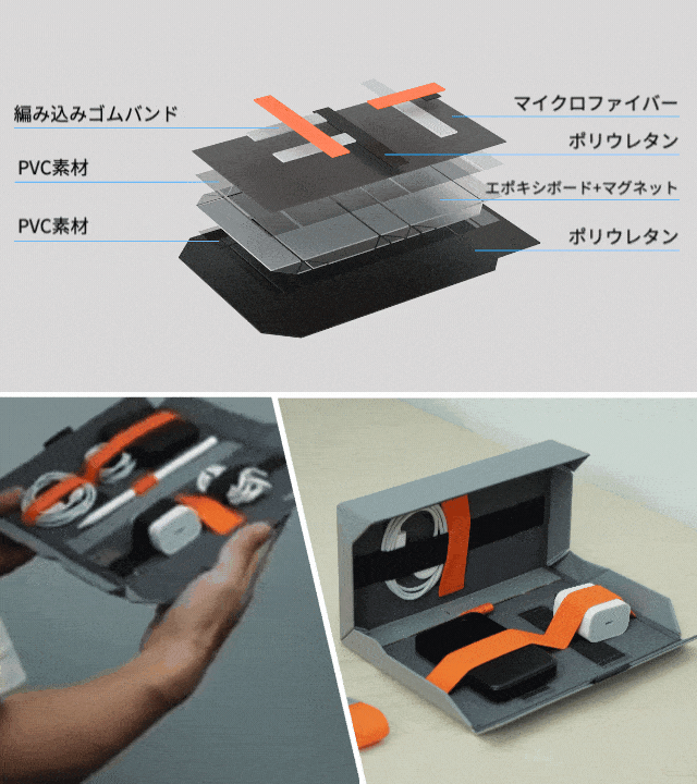 ソフトポーチが多かった従来の片付けアイテムとは異なるハード構造で、大事なガジェットをしっかり保護。圧力からも中身を守るので、安心して持ち運べます。