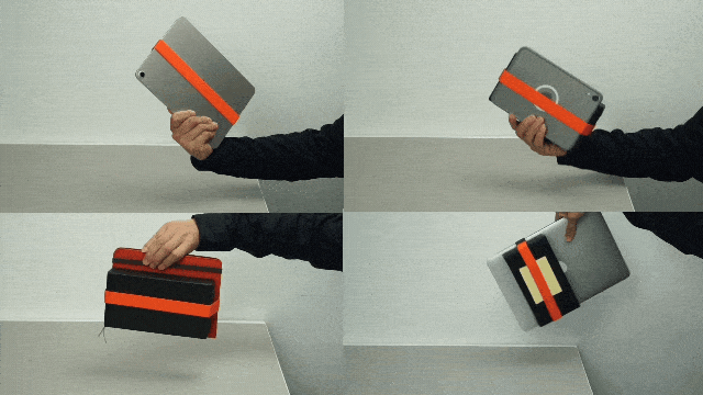 PCやタブレットと一緒に持ち運べる伸縮バンド付きで、荷物がかさばらず、持ち運びが楽に。
