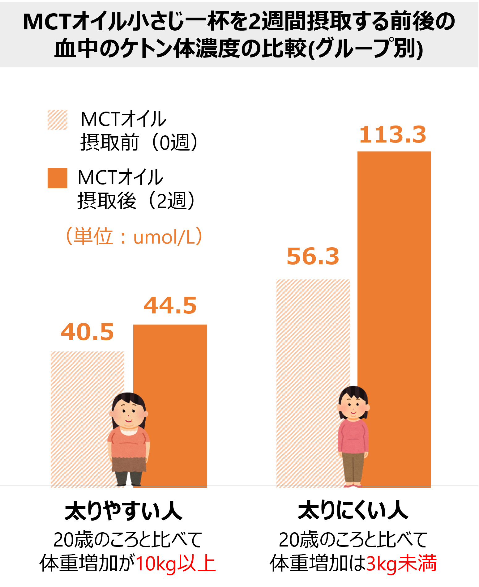 これらのことから、脂質からつくられるエネルギー源であるケトン体は、MCTオイルを2週間小さじ1杯摂取することで増加することがわかりました。さらに、「太りにくい人」は「太りやすい人」に比べて血中のケトン体濃度が多いことが試験結果から明らかに。つまり、太りやすい人・太りにくい人の体質の差は「ケトン体」にあると言えそうです。ただ、太りやすい体質の人でも、MCTオイルを2か月間継続で摂取することで、ケトン体が増加することが分かりました。