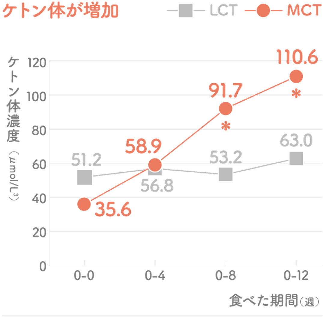 別の試験結果では、健康な成人男女56名が、1日に10gのMCTあるいはLCT(調合サラダ油)を含んだ標準的にバランスのとれた食事を12週間毎日摂取した結果、MCT群ではLCT群と比較して、8週目以降の血中ケトン体濃度が有意に高いことがわかりました。