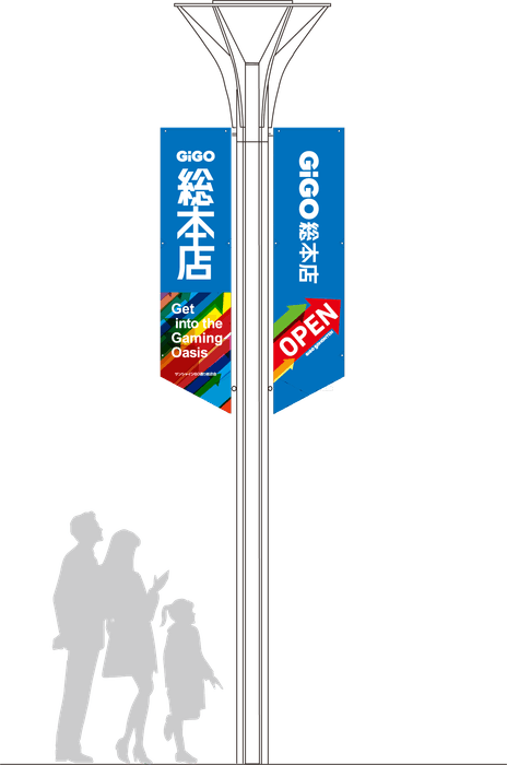オープンを記念して、9月16日(土)~10月5日(木)まで、サンシャイン60通りの街頭フラッグ13か所が「GiGO」カラーに染まります。また、期間未定でサンシャイン60通り商店街入口に「GiGO横断幕」が登場します。