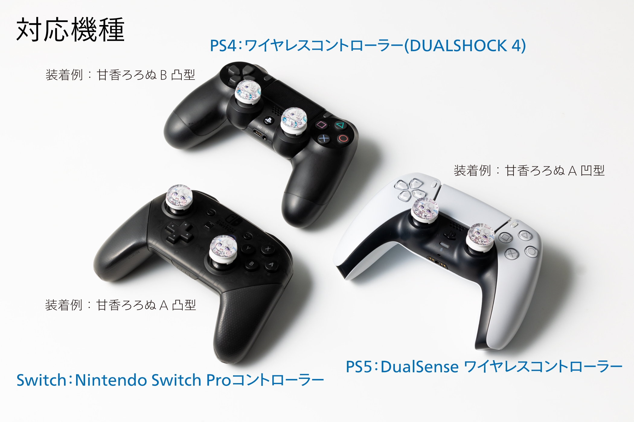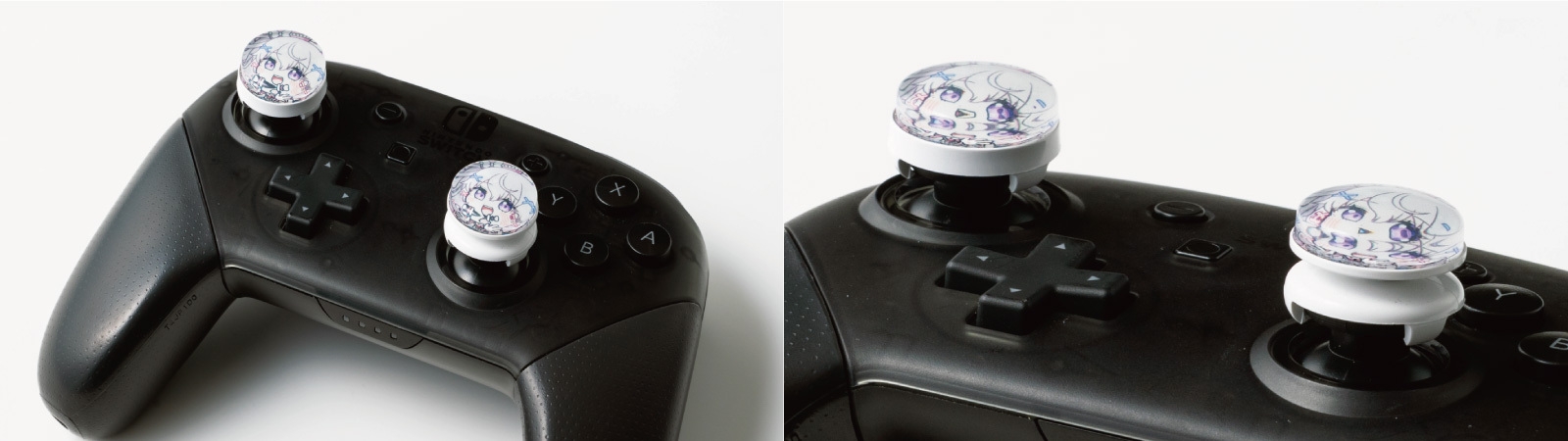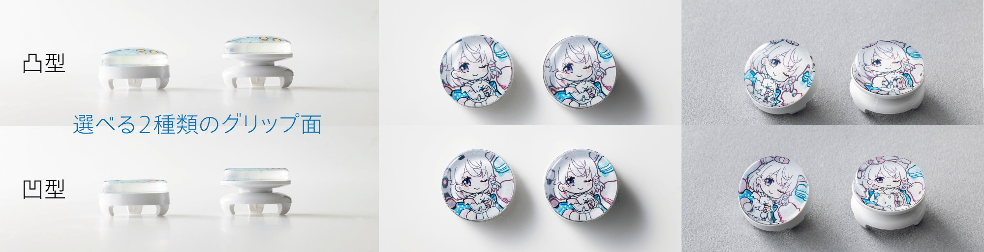 『カラフリ』はゲームコントローラーのスティックに後付けして操作の精確性を向上させるアクセサリ、一般的にFPSフリークと呼ばれるものです。今回発売する『カラフリ』は、4組のVTuber×各2デザインの8デザイン。それぞれにグリップ面が凸型と凹型の2種類をラインアップし、全16種類です。