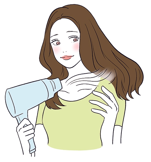ドライヤーでしっかり乾かしてください。すすぎやヘアドライが十分でないと、衣類やまくらカバーに付着することがあります。付着した場合はすぐに洗濯してください。