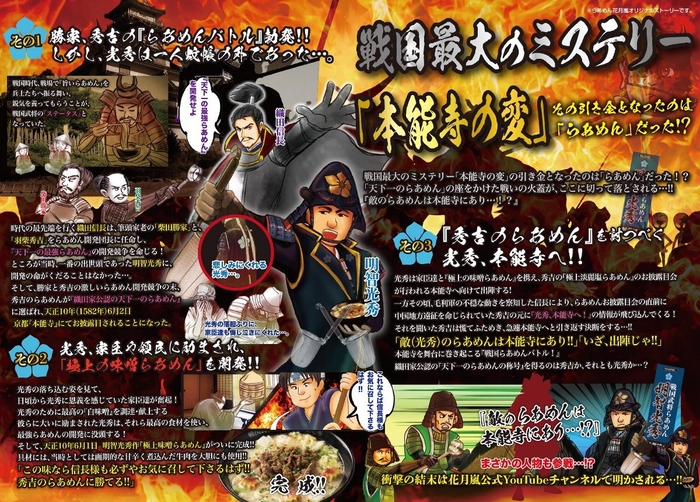 今回登場する一杯は、【戦場で『旨いらあめん』を兵士たちに振る舞い、鋭気を養ってもらうことが、戦国武将達の『ステータス』になっていた】という設定のもと、明智光秀が京都の食材を用いて作ったラーメンを開発し、ラーメンバトルに挑むというオリジナルストーリーを創作。ラーメンとエンターテイメントを融合させた一杯です。