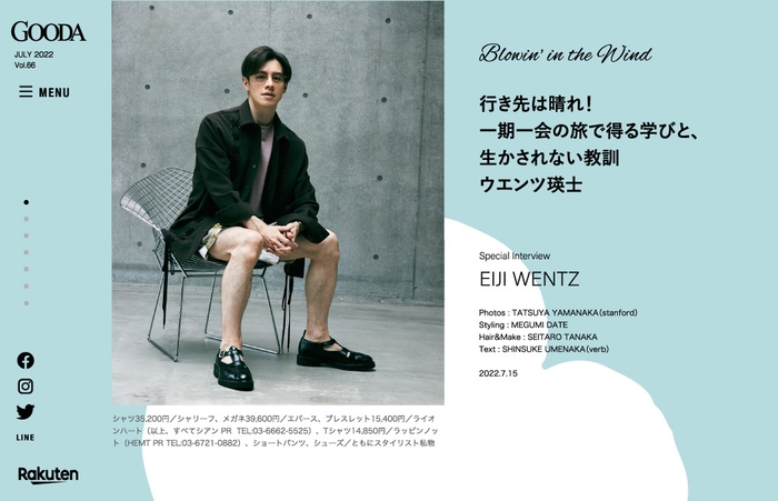 手にするだけで毎日ちょっとハッピーな気持ちになれる。そんな、とっておきを紹介しているライフスタイルWEBマガジン「GOODA(グーダ)」。旅をテーマにしたVo l.66の表紙には、2018年に演劇を学ぶためロンドンへと旅立ち、帰国後は精力的に舞台に立つ、ウエンツ瑛士さんが登場。インタビューでは、「かわいい女の子に言い寄られて、ホテルの部屋までついて行ったら、怖いお兄さんたちに囲まれてしまったこともあります。欲望が先走ると、ろくなことが起きないと学びましたね。いや、学んでいないかな。それも含めて旅だと思っている自分がいるので(笑)」など、旅先でのエピソードをユーモアたっぷりに語ってくれた。また、出演中の舞台「てなもんや三文オペラ」について聞くなかで、子役時代からの付き合いがある主演の生田斗真さんについて「友人である以前に、そんなプロと仕事ができることが楽しくて、頼もしいですね。その上で、友人に戻る瞬間もあって、それがさらに嬉しいんです」とも話してくれた。