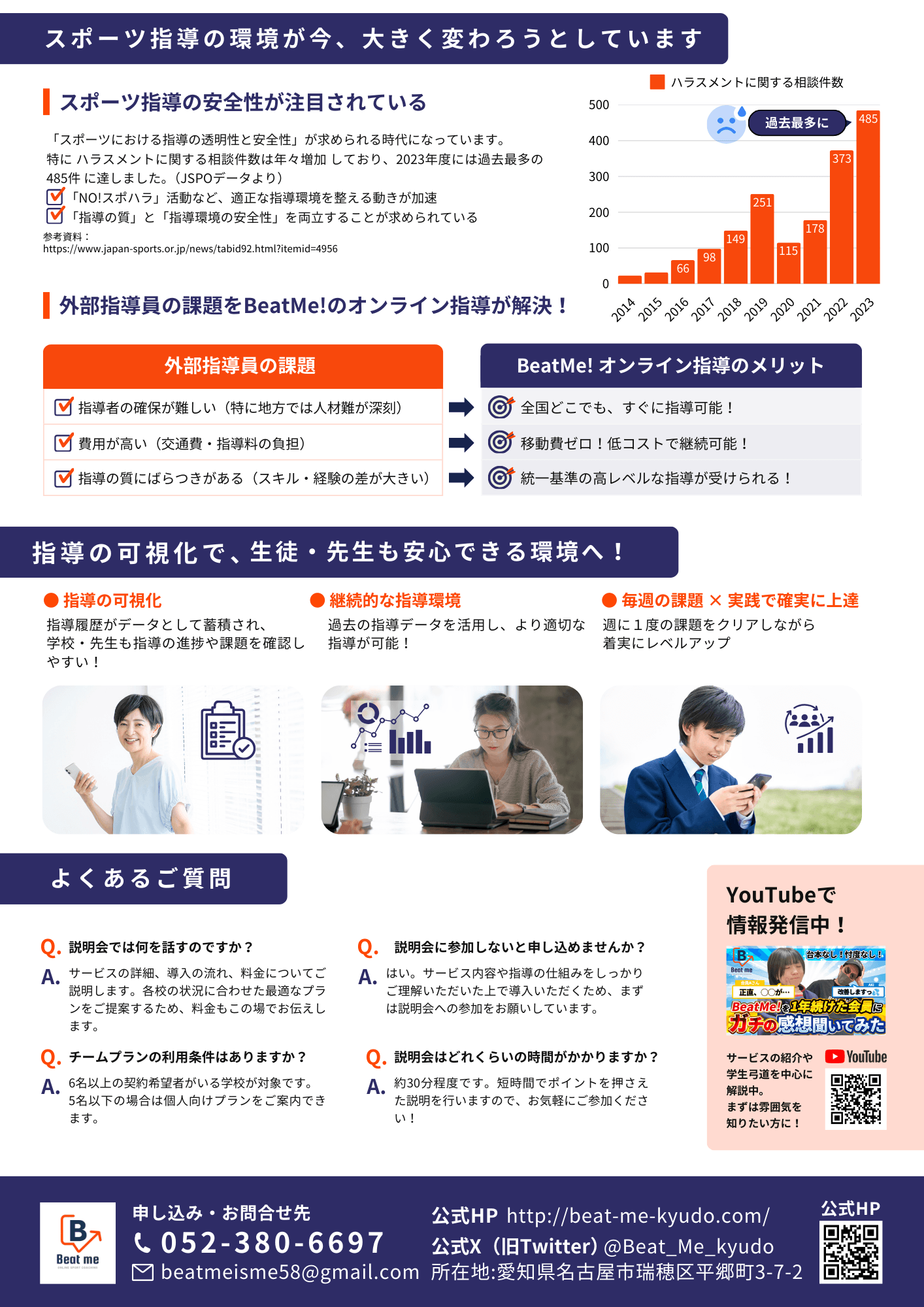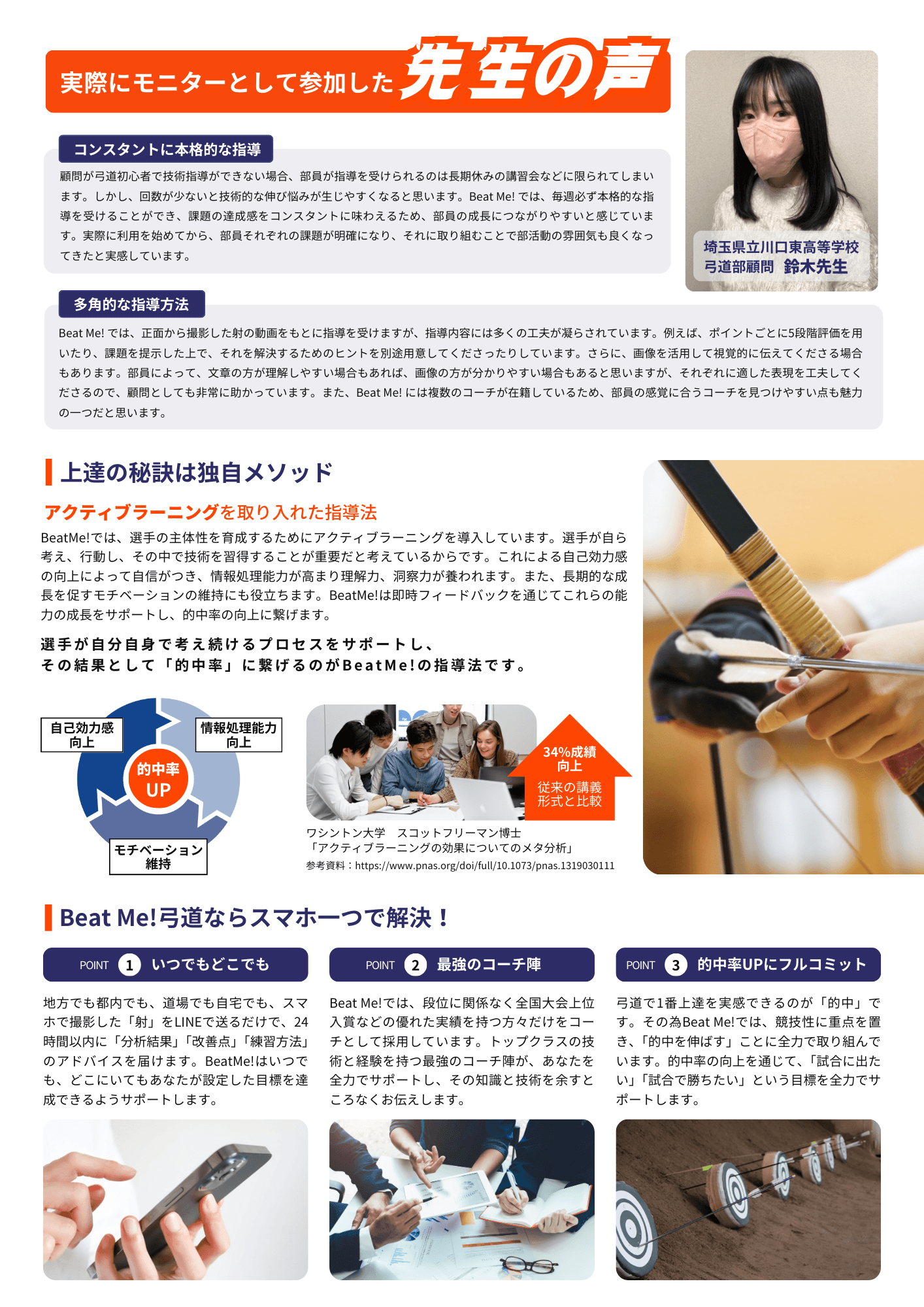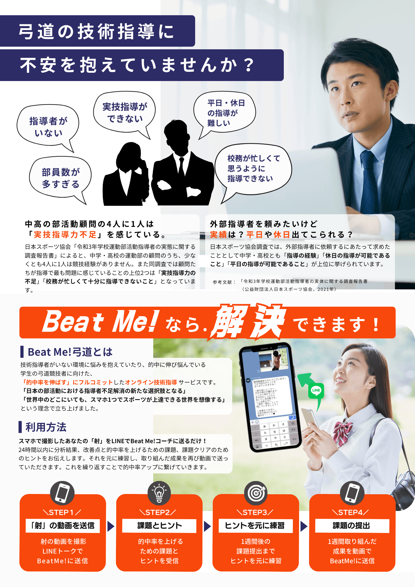 このような状況を受け、「Beat Me!」はこれまで個別指導を中心に展開してきましたが、弓道部全体の指導をサポートする「チームプラン」を新たに提供することで、より多くの学校の課題解決に貢献します。