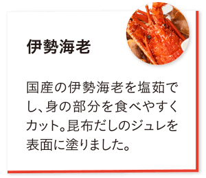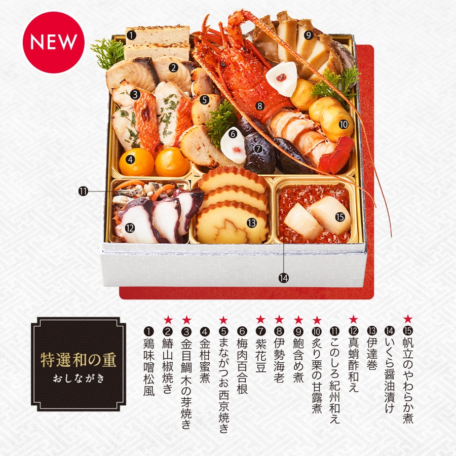 ① 鶏味噌松風 ★② 鰆山椒焼き ★③ 金目鯛木の芽焼き ④ 金柑蜜煮 ★⑤ まながつお西京焼き ⑥ 梅肉百合根 ★⑦ 紫花豆 ★⑧ 伊勢海老 ★⑨ 鮑含め煮 ★⑩ 炙り栗の甘露煮 ⑪ このしろ紀州和え ★⑫ 真蛸酢和え ⑬ 伊達巻 ⑭ いくら醤油漬け ★⑮ 帆立のやわらか煮