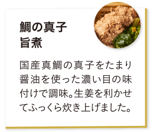 ★㉘ 冬菇椎茸旨煮 ★㉙ 鰆山椒焼き ★㉚ まながつお西京焼き ㉛ 梅肉百合根 ㉜ 金柑蜜煮 ★㉝ 金時芋レモン煮 ★㉞ 紫花豆 ★㉟ 鯛の真子旨煮 ㊱ 菜の花 ㊲ このしろ紀州和え ★㊳ 紅白柿なます ㊴ 足赤海老含め煮 ㊵ 鶏味噌松風 ㊶ 真蛸の柚子煮 ㊷ 伊達巻 ㊸ 丹波黒豆 ㊹ いくら醤油漬け ㊺ 金時芋金団 ㊻ 栗の甘露煮