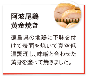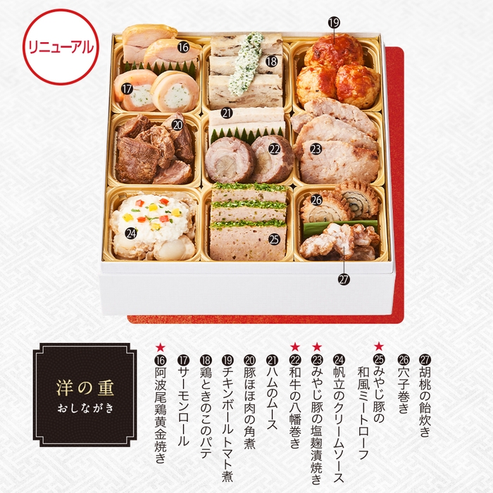 ★⑯ 阿波尾鶏黄金焼き ⑰ サーモンロール ⑱ 鶏ときのこのパテ ⑲ チキンボールトマト煮 ⑳ 豚ほほ肉の角煮 ㉑ ハムのムース ★㉒ 和牛の八幡巻き ★㉓ みやじ豚の塩麹漬焼き ㉔ 帆立のクリームソース ★㉕ みやじ豚の和風ミートローフ ㉖ 穴子巻き ㉗ 胡桃の飴炊き