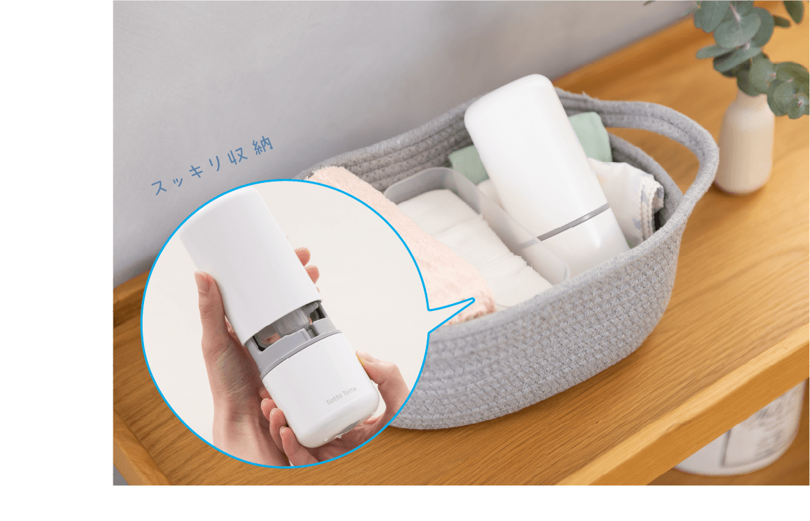 皆様にご愛好いただいておりました『ママ鼻水トッテ 電動鼻すい器』は、『ハンドポンプ鼻すい器』の発売に合わせてブランドリニューアル。よりお客様に親しみを抱いていただけるよう『ソットトッテ』にブランド名を変更しました。リニューアルに合わせて静音性能をアップし、従来品よりもさらに静かな音を実現しました。おしゃれな生活空間になじむスタイリッシュなデザインや、フタ付きで衛生的に保管できることも大好評。