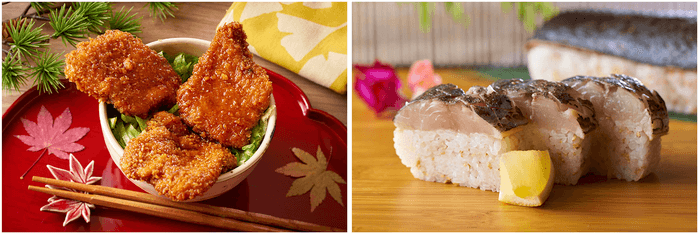 右:こちらも福井名物の料理、焼き鯖棒寿司。人気の一品をお見逃しなく。
