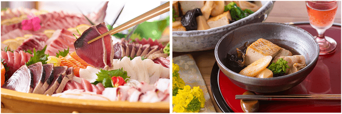 左:お造りには日本酒を合わせてじっくりとお楽しみください。(アルコールは別途有料)