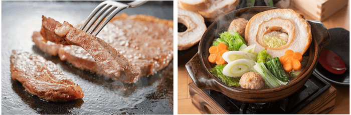 左:ライブキッチンから焼きたてをご提供する「サーロインステーキ」ももちろん食べ放題!
