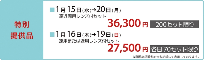 また、遠用または近用ンズ付セット27,500円は、16日(木)・17日(金)・18(土)・19(日)各日70 セット限りでのご用意です。お買得なこの機会にぜひご利用ください。