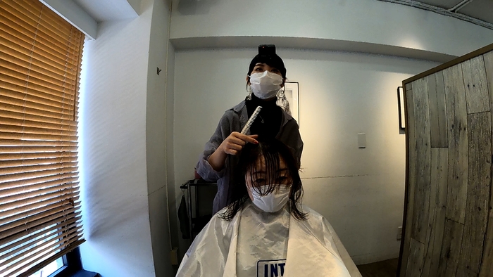 別の日、“くせ毛専門″美容師の野坂さんのお店を訪れたのは、捻転毛と波状毛をミックスした頑固なくせ毛に悩む常連さん。オーダーはセミロングの毛先を狼のたてがみのようにはねさせるウルフカットの進化版で、全体にパーマをかけた「ウルフパーマ」。強烈なくせ毛で大きくふくらんだ髪がどんな方法で改善されていくのでしょうか?