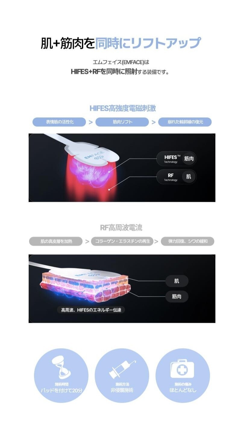 の2つを同時に照射し、筋肉・結合組織・皮膚へマルチアプローチが可能な最新のリフトアップ機器です。