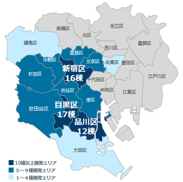 当社が開発するデザイナーズ賃貸マンションシリーズ「LEGALAND」は、開発中案件も含め、これまで東京23区を中心に計100棟を超える開発実績を誇っています。当社がこれまで培ってきた不動産開発のノウハウやこだわりによって生み出される「LEGALAND」は、快適な居住空間をご提供するとともに、優れた投資資産として国内外の事業会社及び個人投資家の方々からも高い評価をいただいています。