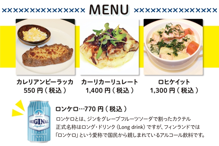フィンランドメニューの他に、フィンランドの国民的アルコール飲料「ロンケロ」も販売いたします(価格:税込770円)。