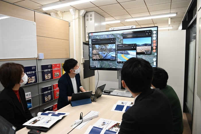 実証実験は大規模災害が発生したことを想定し行われ、リアルタイムで位置情報と映像が確認できるシステム「Hec-Eye」と「国産ドローン」を連携し活用しました。「Hec-Eye」は災害時複数拠点間でのドローンやスマートフォンの映像と位置情報をリアルタイムで共有・確認ができるため、従来よりも情報精度が上がり、より効率的で迅速な対応につなげられることをご確認頂きました。